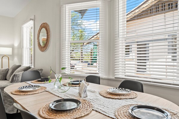 Living & Dining ~Large living room with a 70-inch smart TV and plenty of space to lounge on the comfy cloud couch. ~Spin your favorite vinyl on the record player and unwind in style. ~Gather around the dining table for six plus a bar top for three more— perfect for family dinners or game nights.