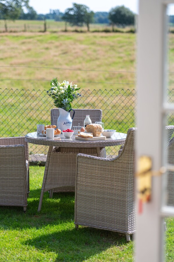 Snug with a comfy sofa, armchairs, wall-mounted Freeview TV, and a wood-burning stove. Patio doors lead to the enclosed garden overlooking the farm.