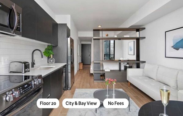 A bright, modern studio with floor-to-ceiling windows overlooking the city & bay. Perfect for couples, solo travelers, or up to 4 guests: - King bed + Sofa bed (hotel-quality linens) - Fully equipped kitchen - Washer & dryer in unit - Fast WiFi - Luxury bathroom with handicap access