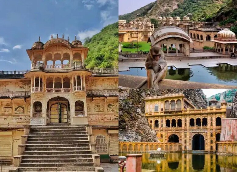 Galtaji Temple (Monkey Temple): This temple complex is located on a hill and is known for its natural springs and holy water tanks. The temple is dedicated to Lord Hanuman and is inhabited by a large population of monkeys. The main temple, along with other smaller temples and pavilions, creates a unique atmosphere.