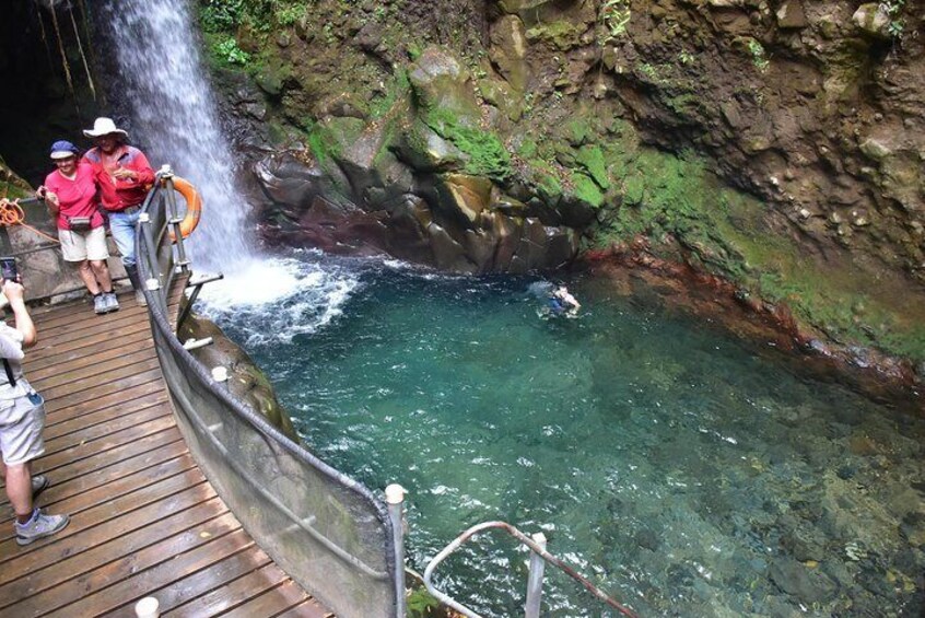 Tour privado combinado de cascada de volcanes y aguas termales