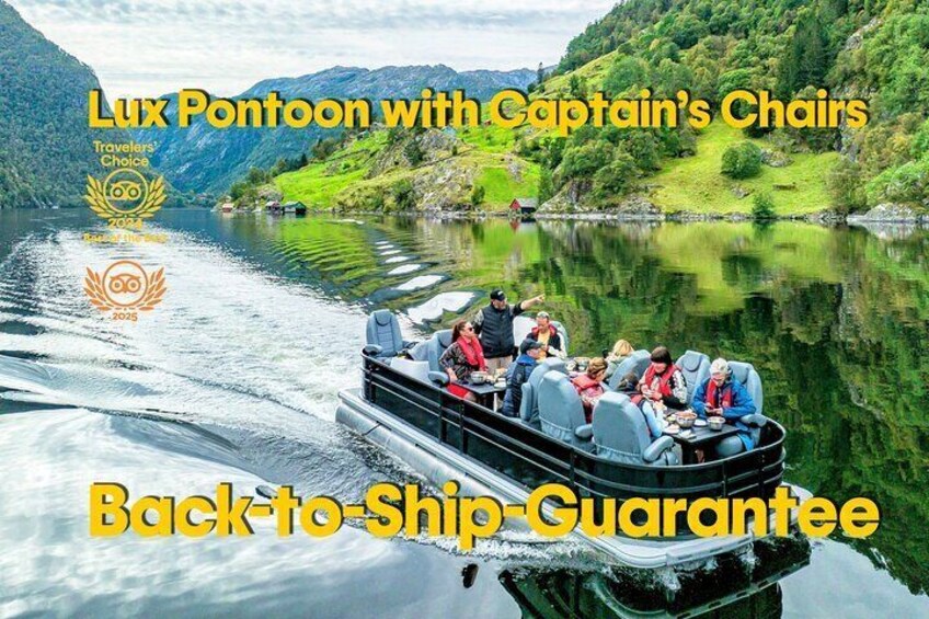 Fjords in absolute comfort: Our Lux pontoon features 8 individual captain’s chairs, stability, space and panoramic views unlike any other boat in Bergen!