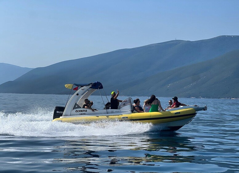 Our tour begins with a thrilling 40 minute speedboat ride to the enchanting Haxhi Ali cave, an natural wonder that beckons with its mesmerizing allure. Where you can swim in the crystal-clear waters and explore for 20 minutes the cave to indulge in thrilling activities such as diving, snorkeling, and discovering the hidden gems of the cave's breathtaking beauty.