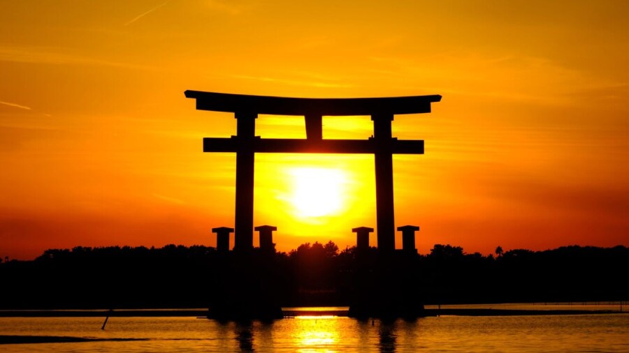 In the serene blue waters of Lake Hamana stands a dazzling red torii gate. As the winter solstice approaches, its beauty reaches new heights as the setting sun shines through its frame and projects golden hues onto the water and sky. Witness this incredible scene for yourself at Bentenjima Seaside Park in Hamamatsu.