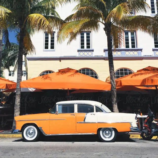 An orange and white car parked in front of a cream and white building, with orange umbrellas outside