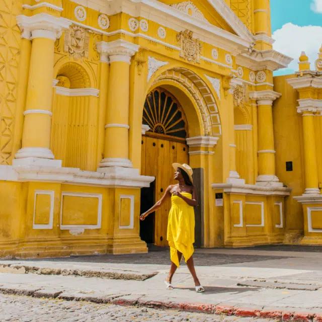 Oneika Raymond wearing yellow in front of an ornate yellow building