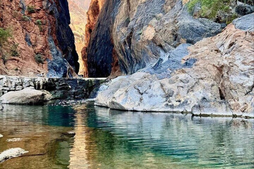 From Fins Beach, we drive towards Wade Shab, this Wade is an enormous canyon gorge that is lined with palm trees and impressive indications of what the power of the water coming down from the mountains can do in nature, with a 45-minute hike up through the canyon Wade (walking shoes are required) we arrive at one of crystal clear water pools tourists can swim through the warm waters from pool to pool, eventually, we come to the last pool where an opening among the enormous rocks allows us to swim into an incredible crevice cave with a small waterfall inside, the sunlight filters in from the outside, turning the water into a beautiful turquoise blue whilst water showers down one side of the cave from the Wade beyond.