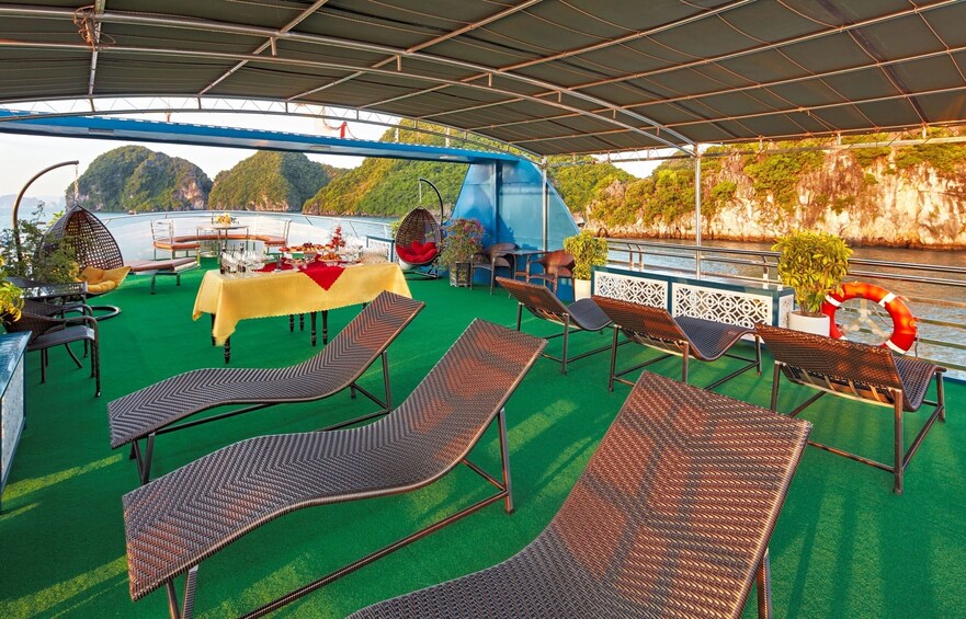 As the day winds down around 5:00 PM, the cruise heads back to Tuan Chau Harbor. This is your chance to bask in the sunset hues while enjoying a festive atmosphere on the upper deck. Sip red wine, relish cakes, and immerse in the beauty of Halong Bay's sunset.