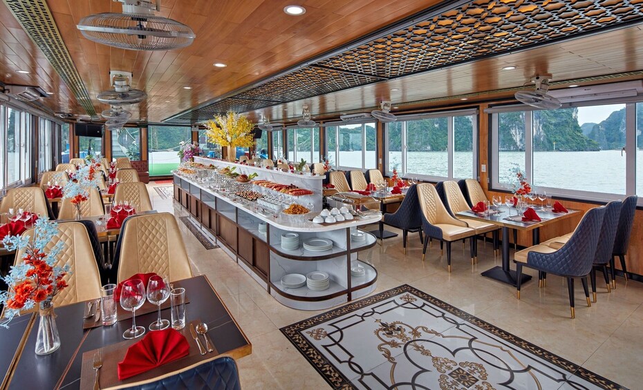 By noon, you're aboard the cruise, embarking on a thrilling 6-hour voyage. Halong Bay, with its surreal landscape of limestone islets and serene waters, becomes your backdrop as you enjoy a delightful buffet lunch on deck. Savor a variety of gourmet dishes that cater to all palates, enhancing your luxury cruise experience.