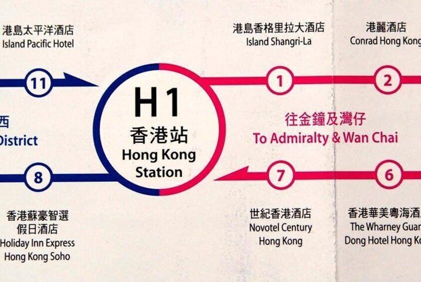 Round trip transfers between Airport Train Station to Hong Kong Station + bus to hotel on Hong Kong Island from 0600 to 2300. Pls offer hotel name & address. You will be advised which bus to take.