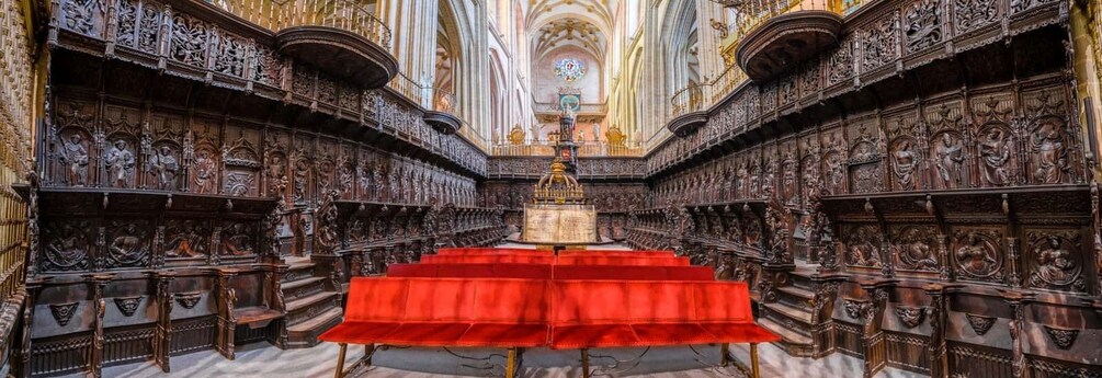 Listen to the history of the construction of the cathedral, beginning in 1471. Marvel at the wooden choir composed of 97 stalls with various examples of religious iconography, finished with the addition of a 17th-century baroque organ. Admire the altarpiece by the renaissance master Gaspar Becerra.