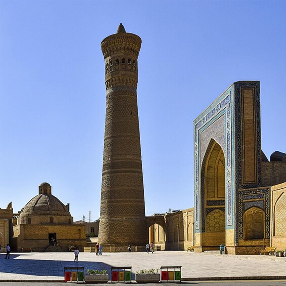 Start your walking sightseeing tour in Bukhara. Visit Lyabi-Khauz Complex (a lively square with a pool, old madrasahs, and shady trees, a favorite meeting spot), Magoki-Attori Mosque (one of Bukhara’s oldest mosques, partly underground, with pre-Islamic layers of history), Chor-Minor Madrasah (a small madrasa with four unique turquoise-domed towers, very photogenic), Trade domes (historic covered bazaars where silk, jewelry, and handicrafts were traded for centuries), Kalyan Minaret (a 47 m tower from the 12th century, spared by Genghis Khan, symbol of Bukhara), Kalyan Mosque (huge mosque with a vast courtyard, able to hold up to 10,000 worshippers), and Miri-Arab Madrasah (a still-functioning Islamic school, famous for its grand blue-tiled façade), Ulugbek and Abdulazizkhan madrasahs (side by side: Ulugbek’s simple elegance and Abdulazizkhan’s ornate design), Ark Fortress (former residence of Bukhara’s emirs, with royal courts, halls, and museums inside), and Bolo-Khauz Mosque (a mosque with carved wooden columns reflected in a pool, opposite the Ark). End of the tour.