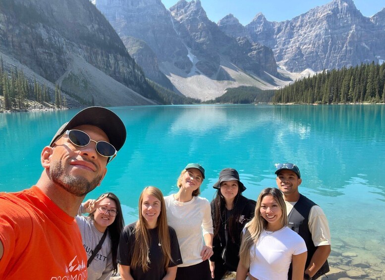 Begin your adventure with a winter wonderland experience at Johnston Canyon. Marvel at the icy spectacle of frozen waterfalls, a stunning fusion of nature's artistry and rugged canyon vistas. During the warmer months, visit the iconic Moraine Lake, where the azure waters reflect the majestic Ten Peaks.