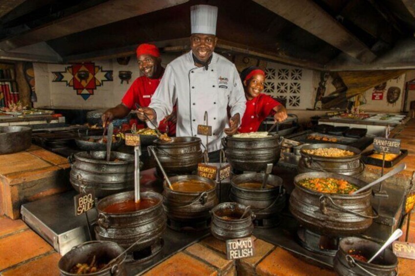 Cap off your day with an authentic African dining experience at The Boma. Sample a variety of traditional African cuisine while enjoying performances by Matebele dancers showcasing war dances. Participate in a fun drumming session that extends late into the night
