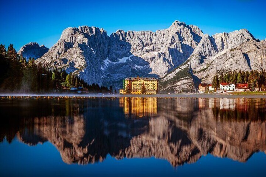 Known as the "Pearl of the Dolomites," this serene lake reflects the peaks of the surrounding mountains.Take in the crystal-clear waters of the lake, surrounded by dramatic peaks. A peaceful spot perfect for relaxation and photography. Walk along the lakeside trail. Enjoy a coffee or light lunch at a lakeside café with panoramic views. ( not included in price )