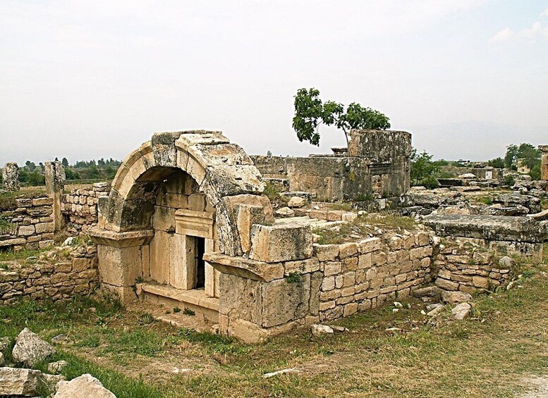 The Turkish name refers to the extraordinary surface of the snow-white cliffs, shaped over millennia by the accumulation of calcium deposited by mineral springs. Legend has it that the Cotton Castle formations are solidified cotton (the area’s principal crop) that giants left out to dry. Dripping slowly down a vast mountainside, mineral-rich water foams and collects in bowls that terrace the decline down the mountainside spilling over petrified cascades of stalactites into milky pools below. These saucer-shaped travertines (or terraces, as they’re also called) wind sideways down the powder-white mountain, providing a stunning contrast to the clear blue sky and green plain below. To protect the unique calcite surface, you are obliged to traverse the area barefoot. Although the terrace pools aren't particularly deep, you can get fully submerged if you want, don’t forget your towel! You shouldn’t leave the Pamukkale Tour without having a healing dip in the sacred fountain of Cleopatra’s pool.