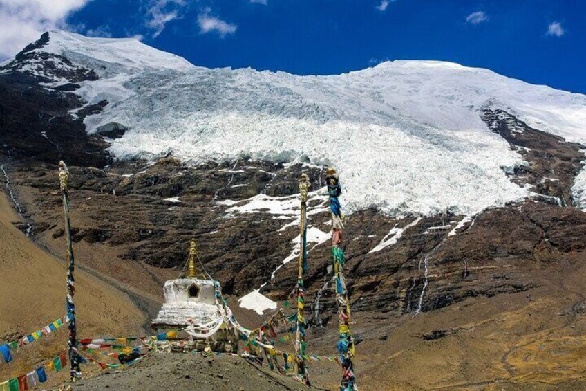 After lunch, drive for approximately 1 hour to visit one of Tibet's most beautiful glaciers– the Karola Glacier, the enormous glacier tongue extends to the roadside, resembling a frozen waterfall hanging over the road and above your head.
