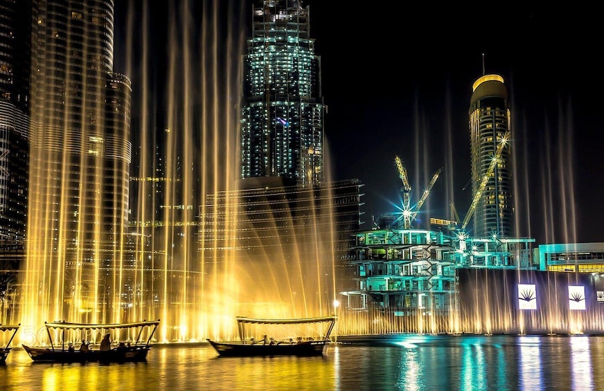 乘坐“abra”水上出租车在 30 分钟的巡游中惊叹于迪拜购物中心喷泉秀的灯光。迪拜喷泉是迪拜市中心迷人的水、音乐和灯光奇观,是世界上最高的表演喷泉。