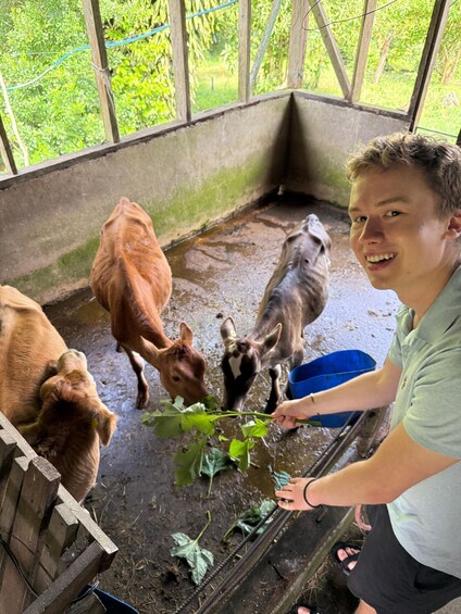 Take a tour of the garden, where you will find banana trees and seasonal fruits and veggies under the care of our family. We also have baby cows, goats, pigs, chickens that are part of the farm operation.