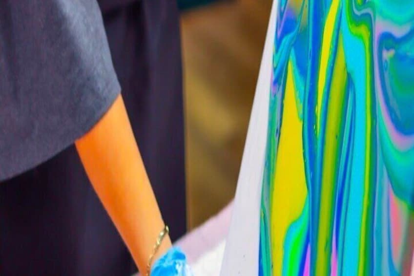 - Fluid Art canvases are left in the studio for drying.