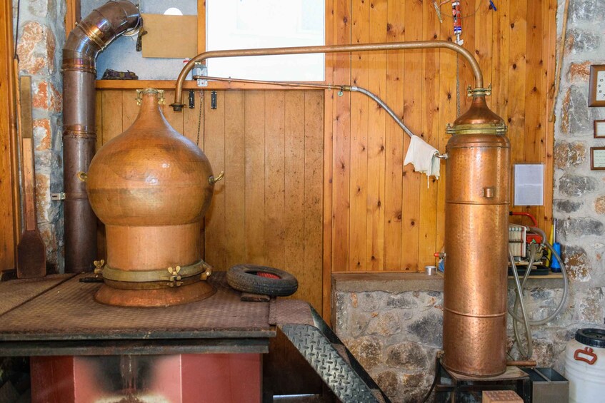 Tras la exploración de la almazara, el recorrido se extiende al ámbito de la producción de «Tsikoudia» o «Raki», el famoso licor cretense, a través de una visita a una destilería local en un pueblo tradicional. Tanto el recorrido por la tradicional destilería convencional como el recorrido profesional contemporáneo permitirán comprender la producción de esta apreciada bebida, que culminará con una sesión de degustación.