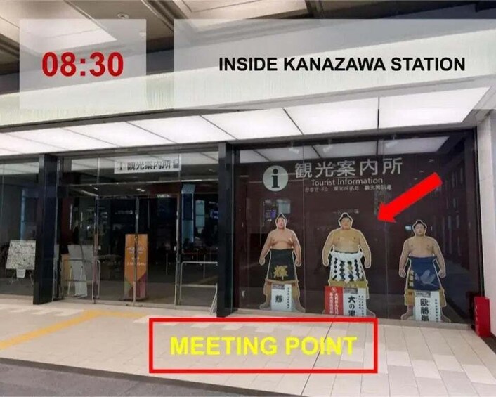 • Japan, 石川県金沢市木ノ新保町1 Kanazawa Station | The meetup point is outside of the Shinkansen ticket gates, in front of the information center. If you are heading out from the Shinkansen gates, look forward and to the right and you will see three large sumo wrestlers lined up. This is where we will be meeting. For those coming from outside the station, you will find this sign immediately inside of the East Entrance of Kanazawa Station. You may wait nearby there until the tour begins at 8:30 A.M. Be sure to look for the guide wearing a Snow Monkey Resorts tour tag.