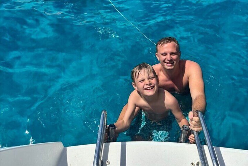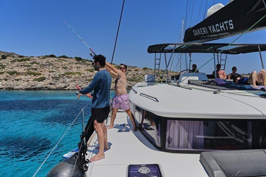 Arrive at the uninhabited Dia Island aboard our luxurious sailing catamaran and immerse yourself in its crystal-clear waters and stunning natural beauty. At this picturesque bay, you can swim, jump from the boat, or explore underwater life with our snorkeling equipment. For those seeking more adventure, try your hand at fishing or enjoy the fun of paddleboarding on our SUP boards. Capture unforgettable vacation photos with the inflatable flamingo, a perfect prop for your memories. Relax to soothing music and enjoy free Wi-Fi while our crew prepares a delicious, freshly made Mediterranean lunch with a homemade dessert on board. This idyllic stop promises a perfect blend of relaxation, adventure, and authentic Cretan flavors.