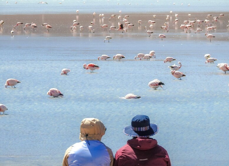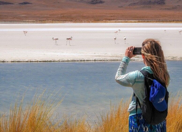 Finally in the day, enter āEduardo Avaroa National Reserveā, Desert of Siloli, Rock tree, and the immense Red Lagoon to see more pink flamingos in their natural habitat.