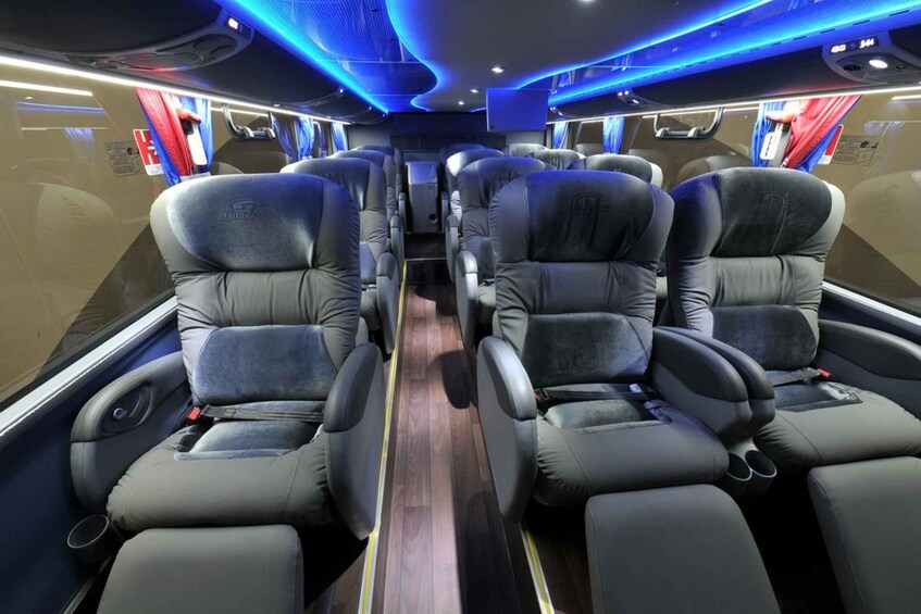 Inside the bus, enjoy the service of Dinner (Meat and Vegetarian Option), Breakfast, Bottle of Water, a Hot Drink, Heating, Toilets, Polar Blanket, Wi-Fi and First Aid Kit.