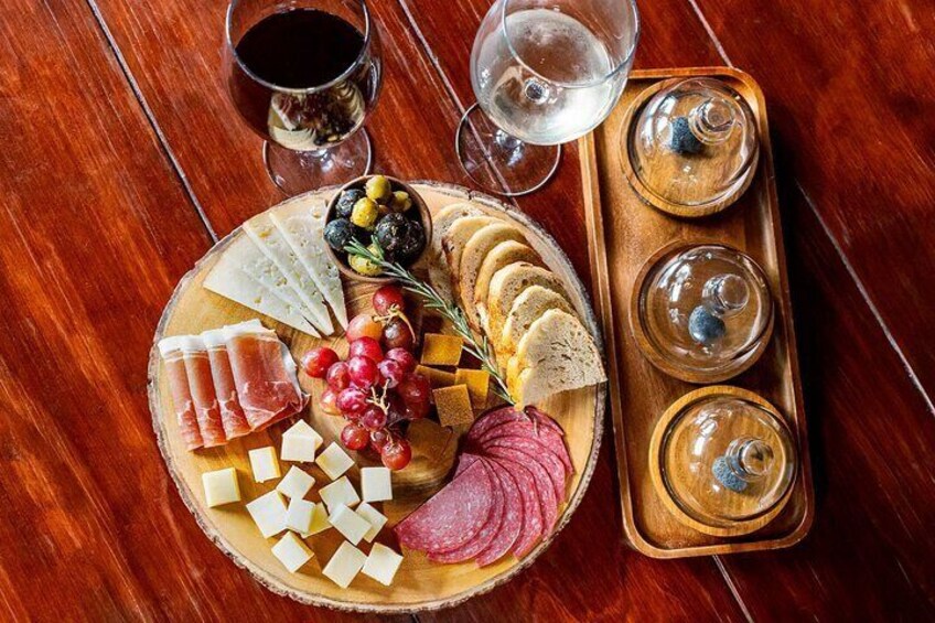 A delicious cheese and charcuterie board, thoughtfully paired to complement the wines.