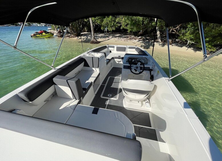 Cruise the sparkling waters of Miami while enjoying your own playlist on our Bluetooth sound system. Enjoy the provided water, ice, and cooler for any extra drinks you bring.
