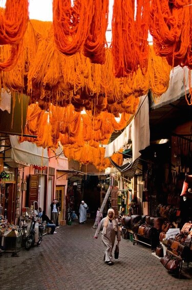 Recorre los callejones de la medina que conforman los aromáticos zocos de Marrakech. Descubre los productos auténticos que los locales tienen para ofrecer, desde artesanías, alfombras bereberes y artículos de cuero hasta babuchas (pantuflas), delicadas joyas y especias exóticas.