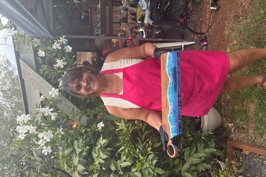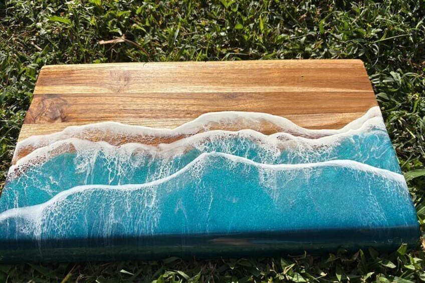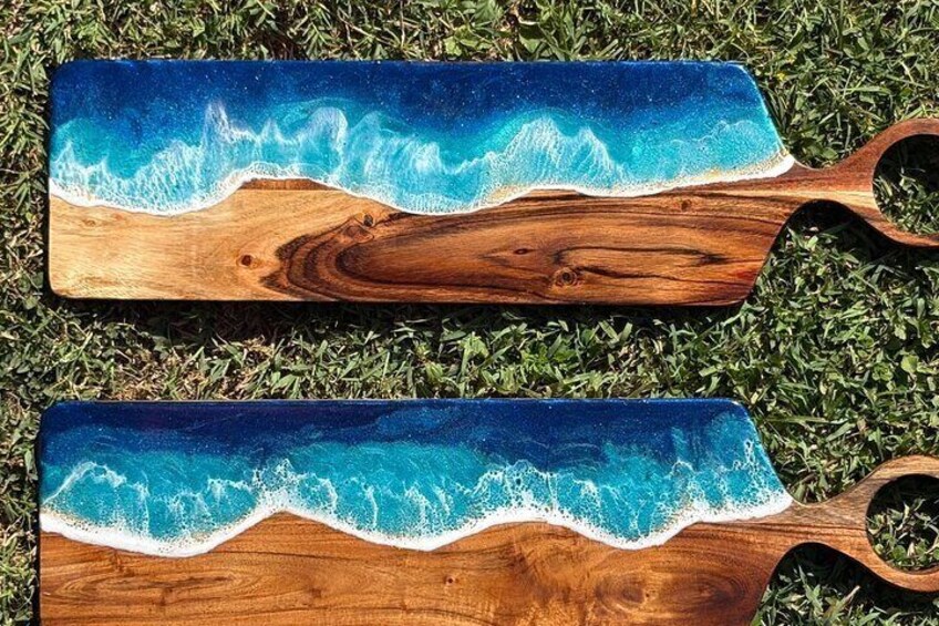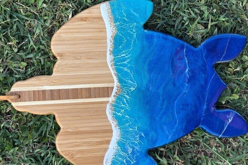 Our small group classes offer close, individualized attention and instruction to guide you through all the steps in creating your masterpiece! In our 1.5-2 hour, step-by-step class you’ll learn the following techniques – all while enjoying Hawaiian Pupu’s (appetizers) and non alcoholic island drinks! FEEL FREE TO BYOB. Included in the cost of the workshop, you’ll get one medium-large size bamboo cheese board AND one small board to practice your design. We offer other specially shaped boards you can select instead for an additional cost. *Once your board is complete it will need to cure 24 hours before it is ready to go home. We will then package your board so you can put it in your suitcase. We also will get shipping and delivery at an additional cost. We provide gloves, aprons, and all the other equipment needed. Your instructor will go over all the tools and materials to familiarize yourself with them before starting the process. including: Prepping your board, taping Measuring, mixing, and pouring the resin Selecting and blending color Marbling and lacing techniques to get the water and wave effects. Feel free to bring any special shells ect. We have a large variety as well