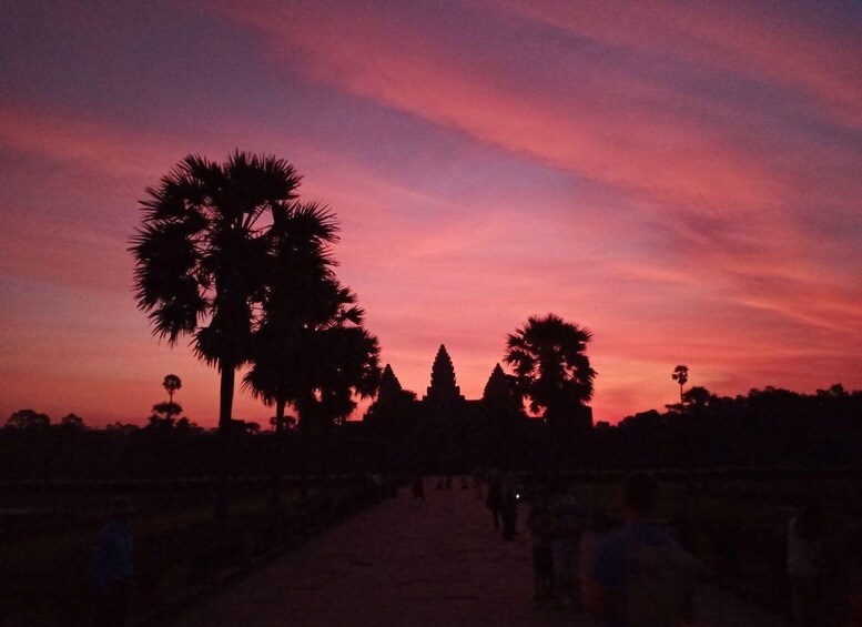 我们将于凌晨 4:30 到您所住酒店的大堂接您。然后,您将被送往吴哥窟,感受有史以来最大的宗教纪念碑的轮廓,当黑暗让位于黎明的第一缕曙光时,它将慢慢浮现在您的面前…… 这真是一个壮观的景象,非常值得今天早点出发!您可能希望在荷花池边占据经典的观景位置,欣赏吴哥窟和它的倒影,或者找到不同的有利位置来欣赏和拍摄这座令人着迷的寺庙。当日出的色彩开始消退时,您将探索吴哥窟的内部,了解它的历史以及寺庙画廊墙壁上精美雕刻背后的迷人故事。
