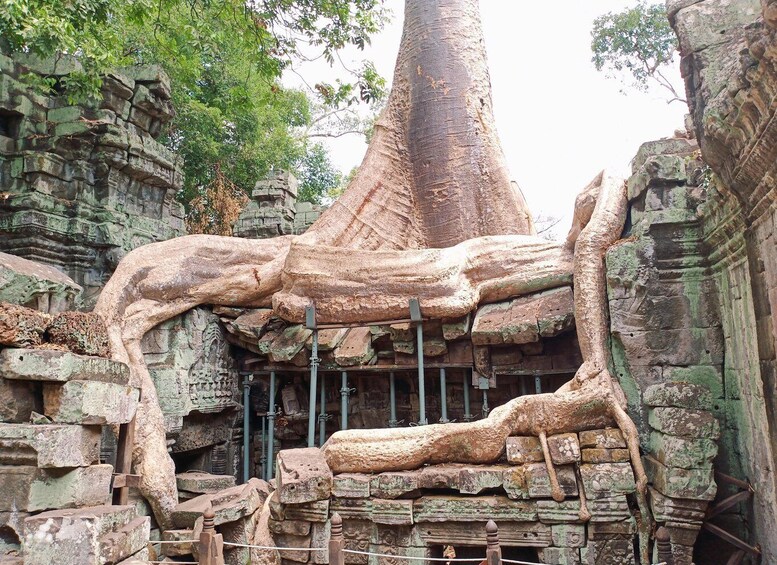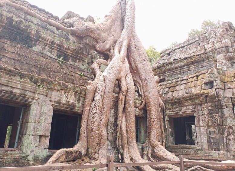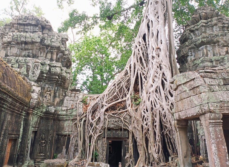 下午,您的一天将从 Srah Srang 国王浴场短暂停留开始,这是一座至今仍有水的大型水库。从这里步行不远便可抵达庞大的迷宫式佛教寺庙 Banteay Kdei。我们的下一站是塔布茏寺,因安吉丽娜朱莉饰演劳拉·克劳馥的电影《古墓丽影》而闻名于 21 世纪。如今,劳拉早已去世,这座寺庙已成为大多数游客的行程之一,这是理所当然的。塔布茏寺的许多角落都展示了斯蓬树(Tetrameles Nudiflora)的根部与覆盖着苔藓的古老石头之间的错综复杂的关系。这里确实是摄影师的天堂,不要错过捕捉自己探险家瞬间的机会。
