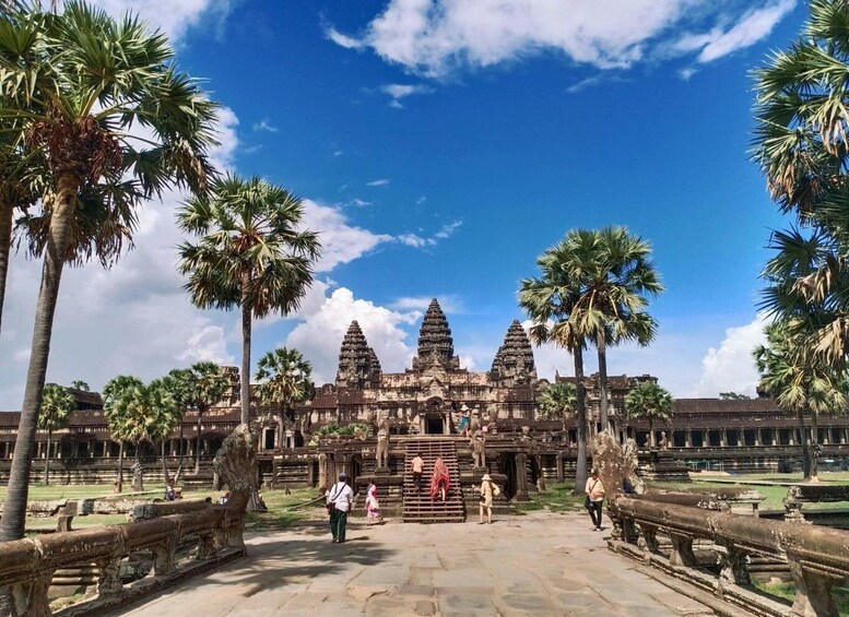 之后,您将前往参观吴哥城,城墙高八米,红土城墙长 3x3 公里,城墙内守护着许多宝藏,并受到至今仍被洪水淹没的护城河的保护。您将从古城南门进入古城。巴戎寺位于正中心,它是时间的无声见证者,216 张神秘的面孔凝视着地平线,人们只能想知道他们多年来所看到的一切。您的导游将指出这里的最佳摄影角度,并对画廊墙壁上的许多复杂雕刻进行解释。然后,您将继续前往巴普昂(Baphuon),那里有长长的堤道和令人印象深刻的巨型卧佛,这是一座拼图游戏,在战争造成长达 37 年的破坏后,直到 2011 年才重新组装起来。Phimeanakas 隐藏在阴凉的丛林中,为那些征服陡峭台阶到达山顶的人提供了不错的树顶景观。继续沿着皇宫滨海大道(俗称“大象露台”)继续前行,您将在风景如画的帕利莱柏威区的阴凉区域结束您的探索。休息吃午饭。