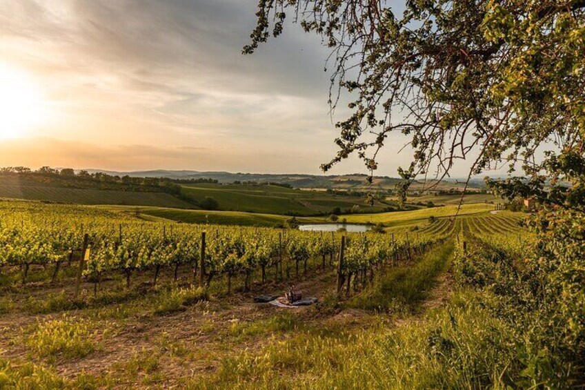 Picnic in vineyards with Bottle of Rosso di Montalcino