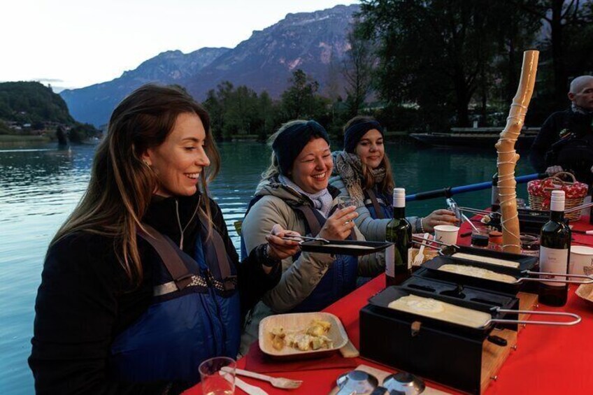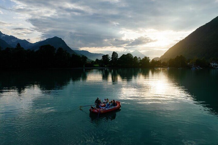 Embark on a unique journey with our raclette dinner cruise from Bönigen to Interlaken. Enjoy melted cheese, white wine, and stunning views while wrapped in blankets. Let our guides steer, allowing you to relish the meal, atmosphere, and quality time on the raft—a distinctive experience that sets us apart.