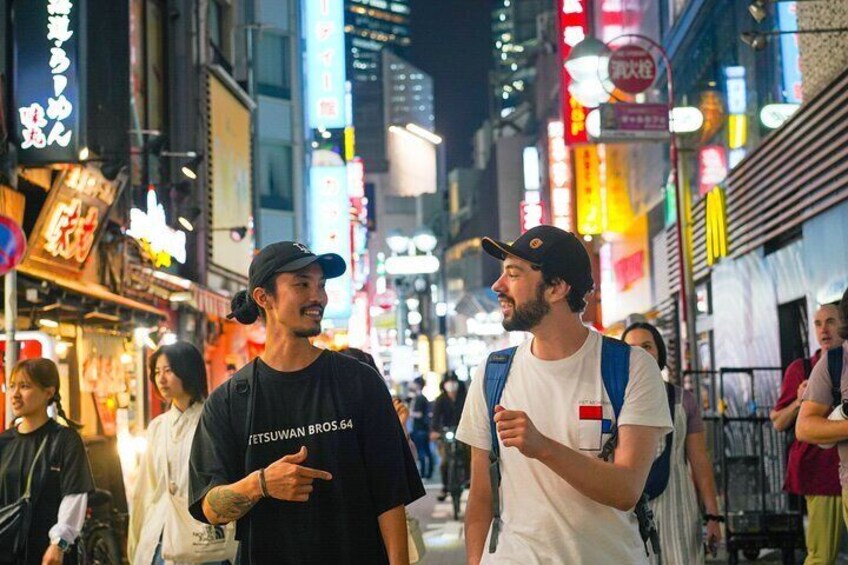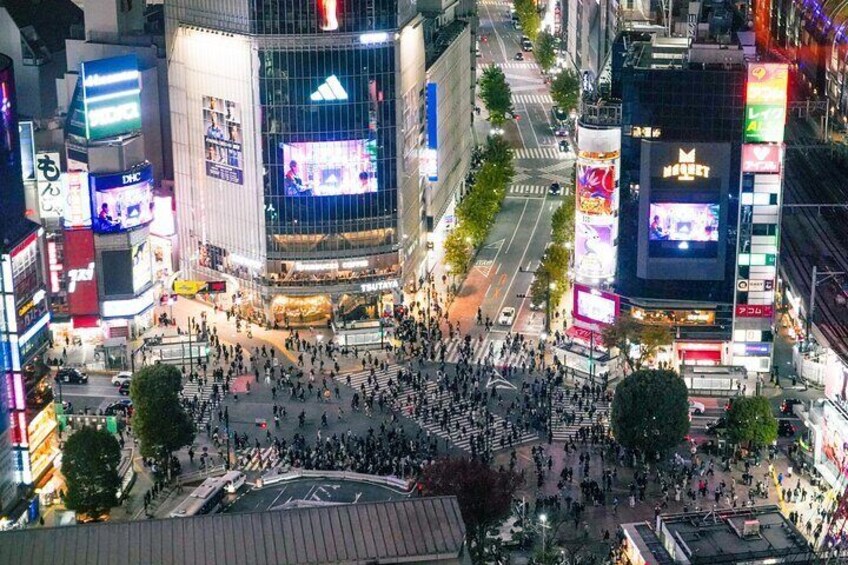 We begin the tour right in front of one of the most iconic landmarks of Japan: the Shibuya Crossing.We'll take a couple of photos, with the hundreds of people crossing it. We'll then head up to the 1st bar through the bustling Shibuya nightlife streets.