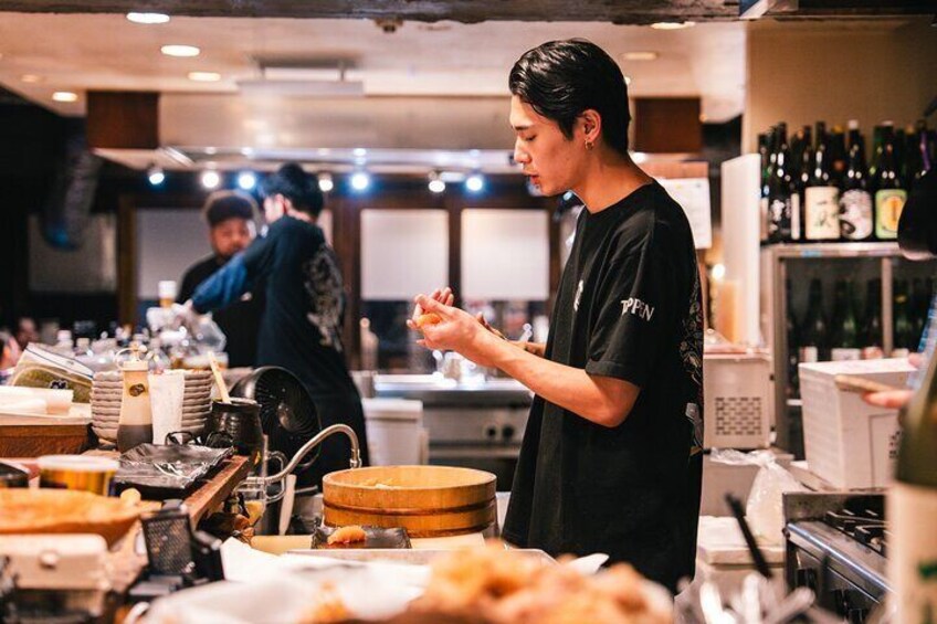 1 bar / Izakaya in Shibuya The second bar is easy to miss if you don't know where you're going! This "street" is indoors, and is called a yokocho (alleyway). It's located in a building on the main street of Shibuya and has over 30 izakaya bars (Japanese style bars) that serve various types of Japanese food and drinks. We'll also encounter lots of local people relaxing after work when bars normally get crowded, so it can be difficult to find seats. But not to worry, we'll reserve some good seats for you. The bars are tiny, people are drinking, and their spirits are high. Expect lots of interactions with the locals!