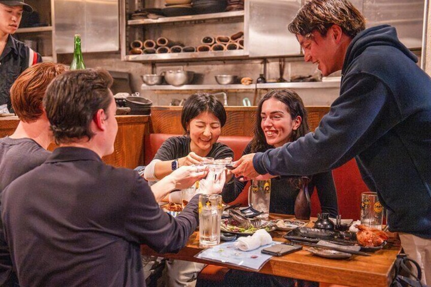 On this tour, we'll crawl through our favorite Izakaya bars in the meat alley that specializes in Japanese beef and sake. You can select 4 drinks & 3 dishes, enough for a full dinner meal from our recommended dishes and drinks at the bar! This is an All-in-one bar tour. All drinks & foods are included so you can come to the tour empty-handed! You can taste various types of Japanese meat: the famous wagyu, the melts-in-your-mouth Kobe beef, or try some fresh beef sushi while you sip on a good cup of Japanese sake or other Japanese drinks. Vegetarian menus are also available! Make the most out of the authentic Tokyo nightlife with our local guide and fellow guests!