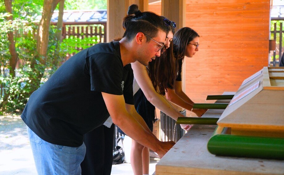 Then we’ll enter the tranquil forest surrounding Meiji Shrine. Inside the shrine grounds you’ll learn proper shrine etiquette and the cleansing ritual at the hand washing basin, all explained and practiced together with the guide so you can try it the right way :)