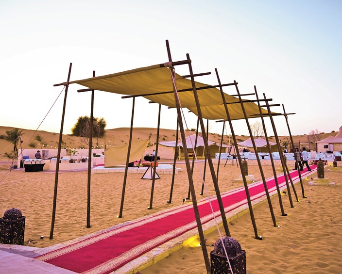 在营地,您可以沉浸在迷人的现场表演中——乌德音乐、苏菲舞和塔诺拉舞、肚皮舞和令人眼花缭乱的火焰表演。夜晚,您可以骑骆驼或骑马、猎鹰和画指甲花,或者干脆在星空下优雅的议会座位上放松身心。返回酒店后,您的神奇体验就结束了。