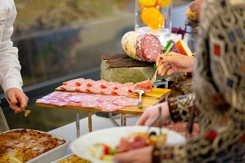 Indulge in a rich Tuscan buffet apericena featuring sparkling prosecco, fine regional wines, gourmet bruschette, pecorino, cured salumi, mini lasagna, fresh pasta, seasonal delights, decadent desserts
